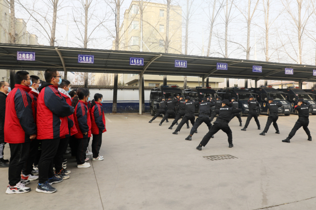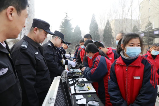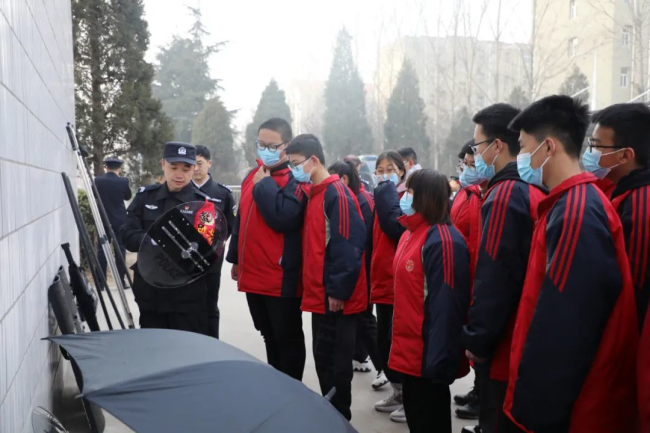 在技能训练场,一件件整齐的警用武器装备映入大家的眼帘,近距离接触手枪、催泪喷射器等各类警用装备……师生们激动不已,并不时提出问题,特警队员详细作答。