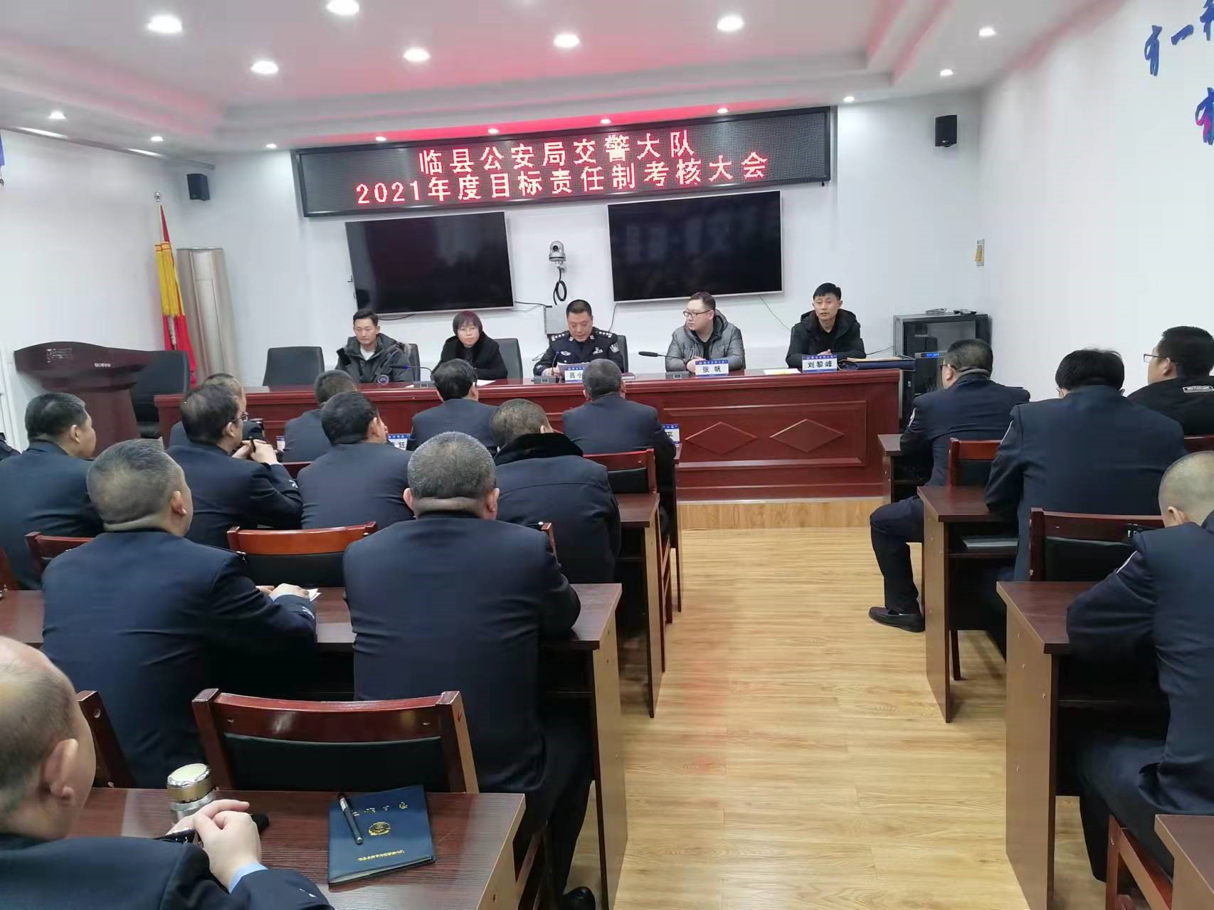 考核会议上,吕小唐大队长首先对考核组一行表示热烈欢迎,接着考核组组长薛凤梅就考核内容、项目、程序及纪律提出了具体要求,大队长吕小唐代表全队一班人从2021年重点目标任务完成情况、队伍建设、执法规范化建设、岗位责任制度落实、交通秩序整治、事故预防“减量控大”以及农村道路管控“千灯万带”工程等方面进行了大会述职,县委、政府考核组充分肯定了临县交警队2021年所取得的成绩。