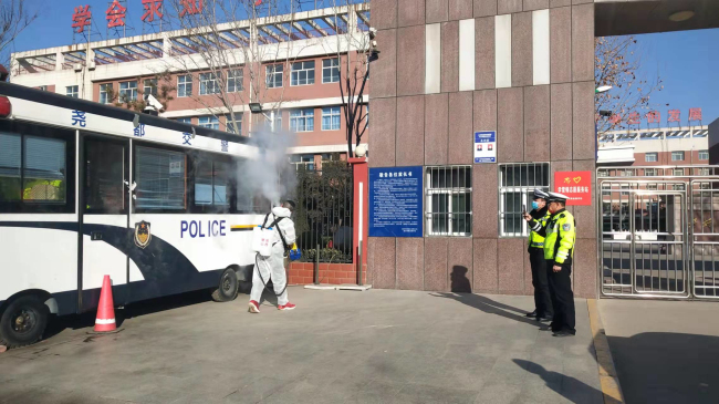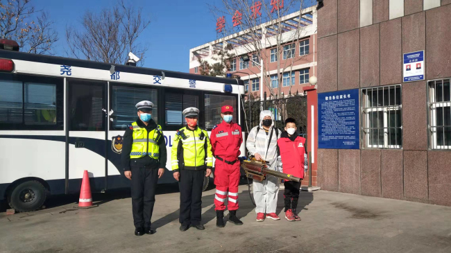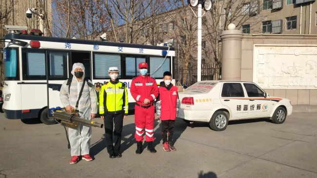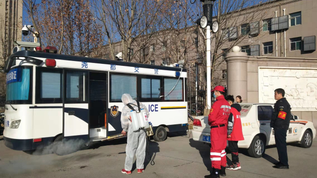 本网讯:(景文杰吉园)为全力做好新冠肺炎疫情防控工作,积极为广大公安民警营造安全、健康、卫生的执勤环境,1月17日上午,尧都天龙救援队专程到东城开展义务防疫消杀工作。