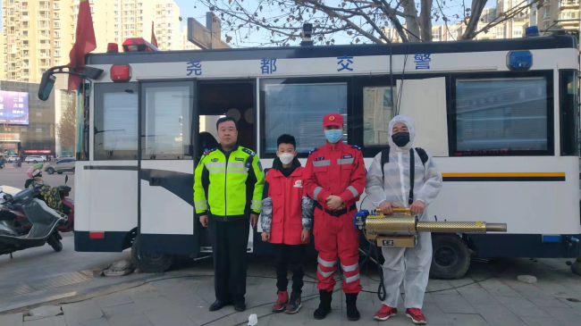尧都天龙救援队秘书长景文杰同志17日上午率领尧都天龙的伙伴们身穿防护服、手持弥雾机,采用地毯式喷酒消毒液的方式,对区政府交通岗亭、华州路交通岗亭、解放路学校交通岗亭、尧都公安东城执法站等进行了全面细致消毒,力争做到全方位覆盖不留死角。消杀现场,烟雾弥漫,气味刺鼻,但是天龙救援队队员们却没有丝毫懈怠,大家纷纷表示,公安民警为创建东城和谐交通,风吹日晒,不辞辛苦的坚守岗位,此次义务消毒也是希望能够让民警的工作环境更加舒适安全,更是表达尧都天龙救援队对公安民警辛勤付出的感谢。