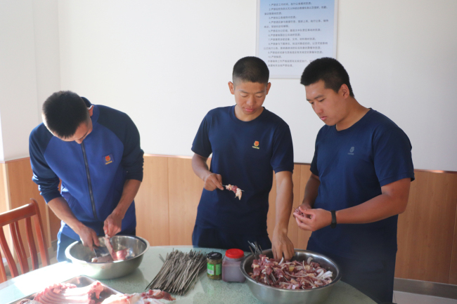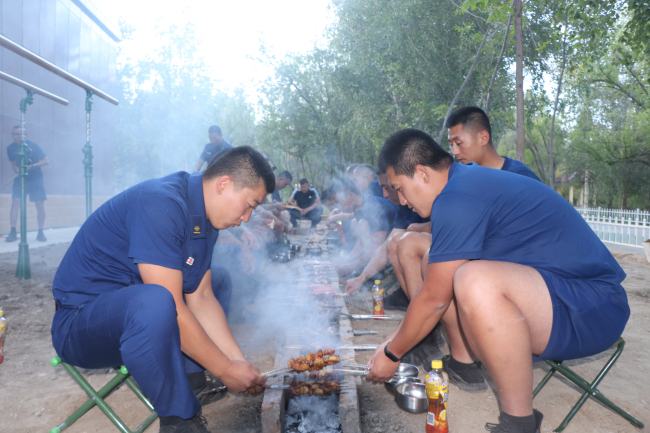 临近傍晚,伴着阵阵微风和嘹亮的歌声,烧烤晚会在热闹欢快的氛围中拉开了帷幕。队员们不分你我,亲如兄弟,兴高采烈地拿出早已准备好的食材动起手来,烤肉、K歌、倒饮料,现场井然有序,一片其乐融融,不一会儿,现场便弥漫起孜然和烤肉浓浓的香气。“班长,你尝尝我这串烤肉。”“味道不错,就是火候欠了点,看班长给你烤。”队员们相互品尝对方的烤肉,不知不觉中一天工作的紧张和疲惫已经烟消云散。“干杯!”在指导员张宜凯的带领下,大家饮尽杯中饮料,随后便共叙兄弟情感,畅聊工作生活,欢声笑语遍布席间。