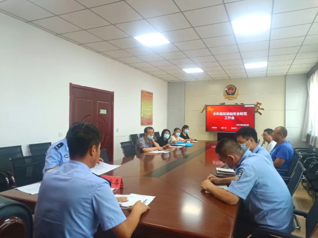在加油站安全防范工作会议上,永和县公安局治安、反恐等部门通报了前期对各加油站检查的相关工作情况,特别是散装汽柴油销售安全管理工作的相关情况,并对上级公安机关在会议、文件通知中针对散装汽柴油销售安全管理的具体要求进行了详细解读。