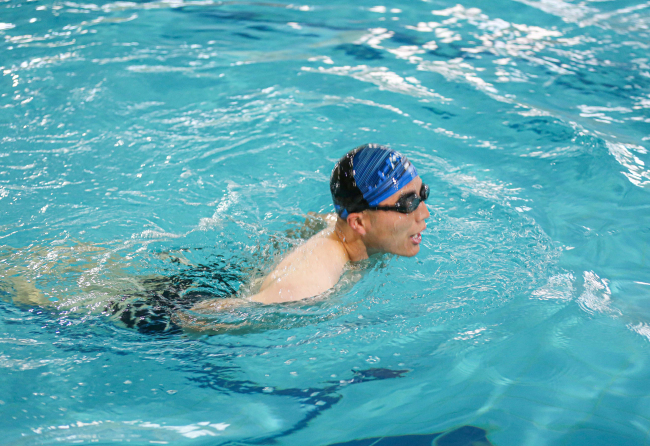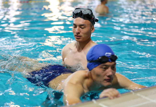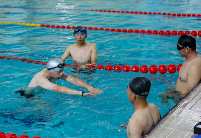 “要先吸一口气,含在嘴里,身体进入水中后,先蹬腿然后再抱水,一步一个动作,分步进行,同时在水中不要急着吐气,等头快要露出水面时再吐气,随即吸气,然后重复动作。”“游泳过程中,身体一定要放松,始终保持身体处于轻松自由的状态,才能不紧张,慢慢寻找适合自己的节奏……”游泳教员结合训练进程耐心细致的为队员们讲解动作要领。