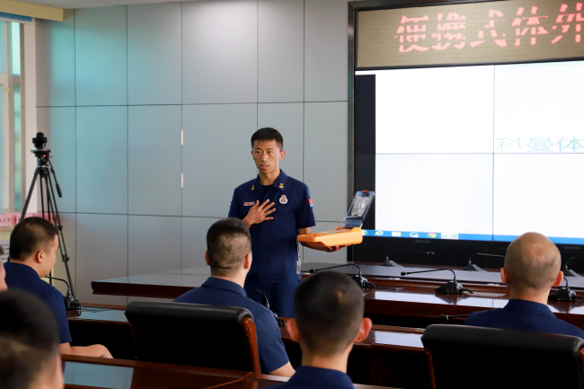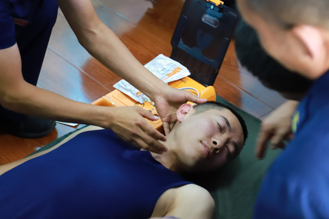 培训中,卫生员拓新满组织全体消防救援人员观看了自动体外除颤仪(AED)的操作使用方法,详细介绍了自动体外除颤仪(AED)设备的使用方法和放置点,细致的讲解了心肺复苏的基本流程和步骤,并通过“现场救护”实施心脏复苏抢救,为大家演示了操作要点,包括观察周围环境、判断是否丧失意识、判断有无自主呼吸、判断有无颈动脉搏动、进行胸外心脏按压、清理口腔异物、开放气道、人工呼吸等环节,反复多次强调操作中的注意事项。参训消防救援人员积极互动,大家纷纷上台实际操作演练,教练员作了细致的点评纠错,取得了良好的教学效果。