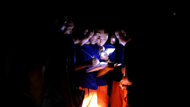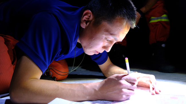根据识图用图的训练要求,各小组需要利用地图通过计算和方位测量确定现地位置,并通过现有数据进行测算目标点的位置,再利用指北针与地图对比寻找目标点,最终找到提前藏好的目标点字母数字,这就要求全体队员都要掌握看图用图的基本常识,克服夜间按图行进的干扰。和白天训练相比,夜间训练具有能见度差、组织实施难的特点,完成任务要比白天更为复杂,作为国家应急救援的主力军、国家队,队员们丝毫没有被这些困难所压倒,反倒是这种困难让他们有了一种“不破楼兰终不还”的坚定信念。