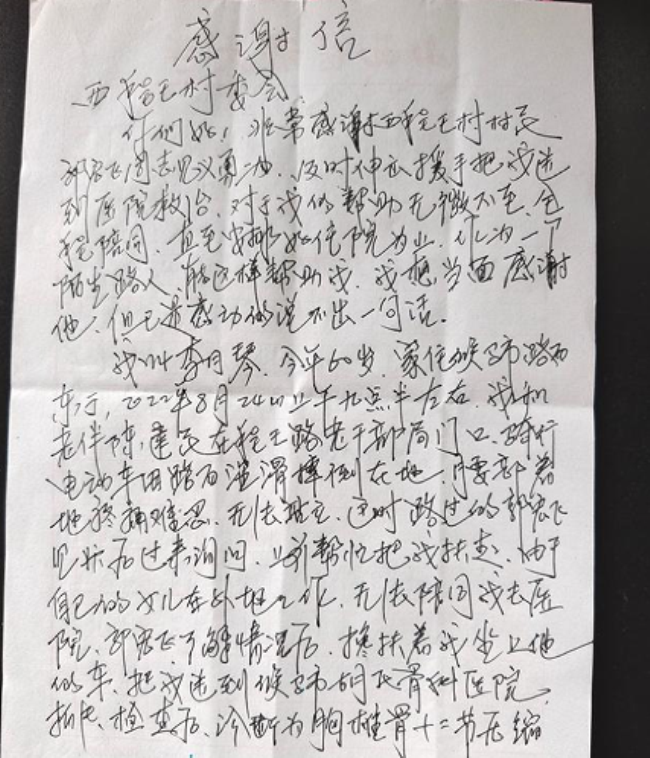 8月30日上午,李阿姨的老伴陈建民特意带着感谢信和一面锦旗送到了郭宏飞所在的村委会,表示感谢,说:“现在这社会,看到老人摔倒,看热闹的多,敢帮忙的少,这种好人好事得表扬,别寒了好人心,尊老爱幼是中华民族的传统美德,希望人人都能热心肠、见义勇为,发扬和谐社会正能量!”