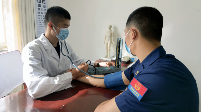 做好卫勤保障,防止热射病发生。炎炎热日,防暑降温不可忽视,大队组织专人对班级、营门警卫等地空调等电器进行检修,确保指战员拥有凉爽的工作和生活环境;卫生员每天深入训练现场和执勤一线进行伴随式保障,根据天气情况和训练进程,密切关注参训指战员身心状态,并结合训练强度和节奏提出专业建议,同时携带足量风油精、藿香正气水、仁丹、口服补液盐等多种常用口服药品,以及常用的注射液制剂和注射用药物。还要备足冰块、冰水以及简易冷水浸泡降温装置,随时准备诊治可能出现的中暑情况。
