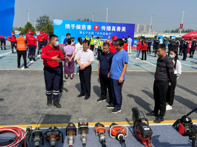 活动现场,多支志愿者机构进行了项目路演。由尧都天龙和蓝天两支救援队携带上百件各式救援装备进行现场展示,其中不乏水下搜索机器人、声呐探测仪、大型抛投无人机等高科技救援装备,以及液压剪、液压破拆器等重型救援装备,救援队员们现场给群众演示心肺复苏、AED使用等急救措施。新百汇社区应急救援站是尧都区志愿者联合会承接的壹基金支持项目,通过在社区建设应急救援站,提升社区应对突发急救事件的响应能力,增加应对突发事件的应急处置能力,该站的建设是慈善支持应急救援的新成果。