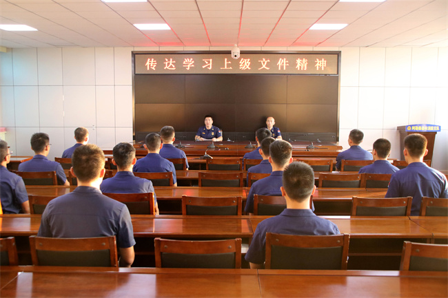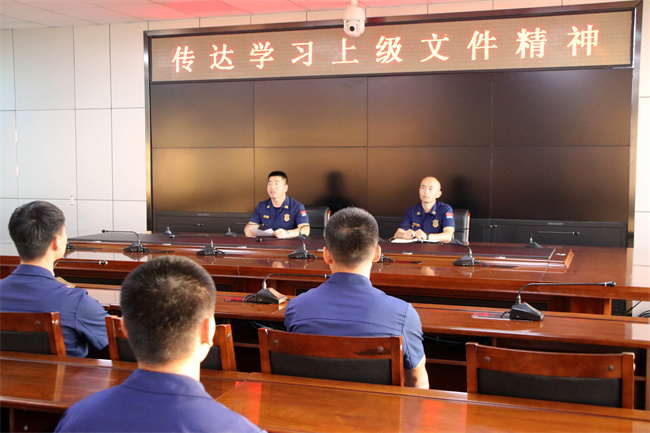 总队电视会议结束后,中队党支部书记孙飞虎同志第一时间召开支部委员会专题会议进行安排部署,而后向全体消防救援人员传达学习王总队长在总队电视会议上的讲话精神,通过采取原文领学、集中跟学等形式,推动会议精神在中队落地落实落细。