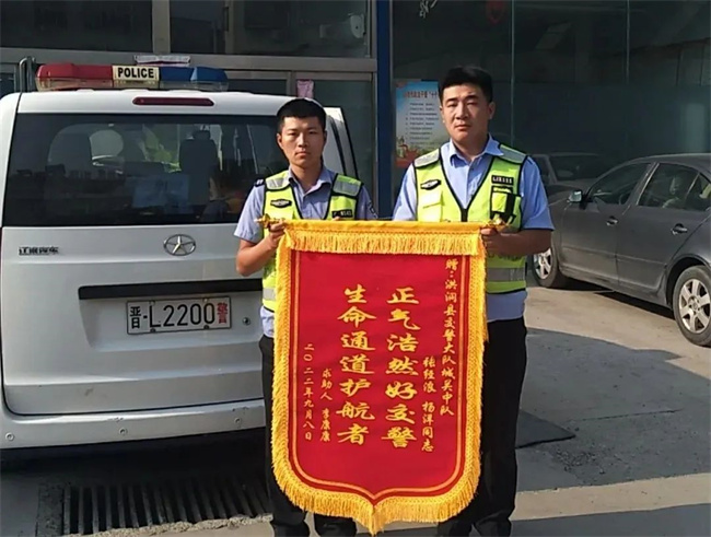 9月16日,患者家属来到城关中队,将一面印有“正气浩然好交警、生命通道护航者”的锦旗送到了民警手中,对民警为民服务的工作态度和热情服务给予了高度赞扬。