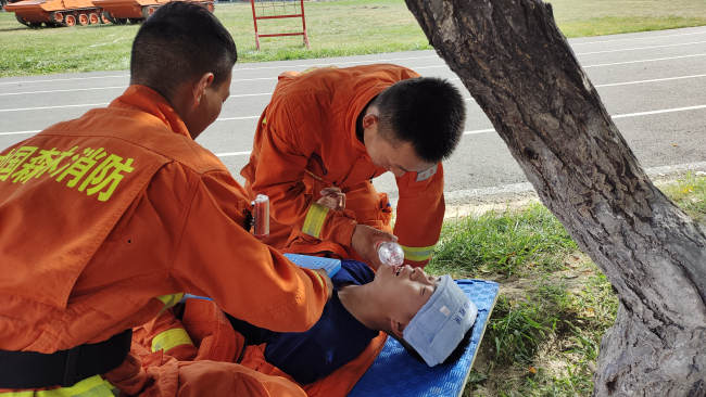 支队结合任务需要,科学安排训练时间和内容,采取“错时制”训练,将室外训练课目尽量安排在早、晚进行,高温时段减少大强度体能训练,保证消防员身体健康、精力充沛,安全无事故。训练中,坚持干部跟班作业,履行好“安全员”职责,在训练场进行重点人群监测,准备好现场快速降温设备,制定现场抢救预案。一旦发生中暑,应在“黄金半小时”内将体温降至目标水平,以尽量减少中暑所致的伤残和死亡。