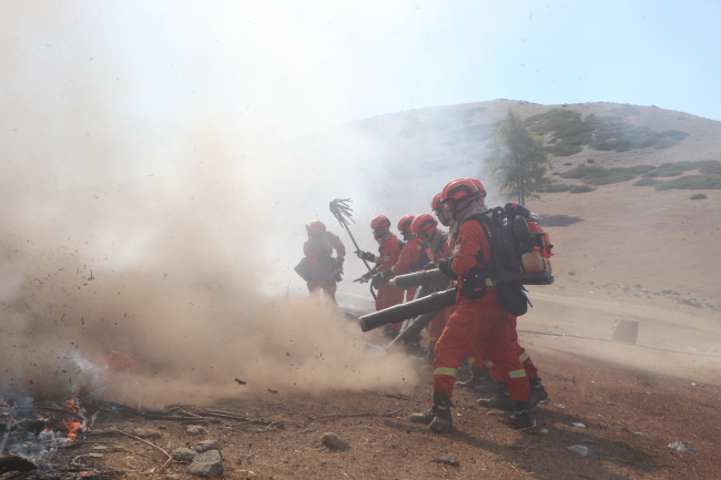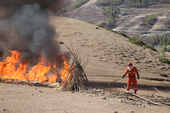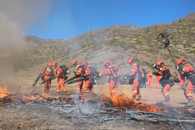 上午12时许,一股浓烟升起,200米长的火线瞬间燃烧,犹如一条气势汹汹的巨龙,随着演练总指挥一声令下,应急演练正式开始。演练中注重力量聚集、协同配合、指挥控制、战法运用,突出森林消防队伍“打火头,攻险段”,地方扑火队重点清理火线、看守火场。同时,根据火场态势,注重采用“常规灭火”和“以水灭火”相结合,常规分队和水泵组分别从火场东侧和西侧切入,对火线进行合围。灵活运用“两翼推进、追歼火头”“打清结合、稳步推进”等多种战法,整个环节衔接紧密,有效检验了参演人员快速反应、高效扑救、综合保障的能力。