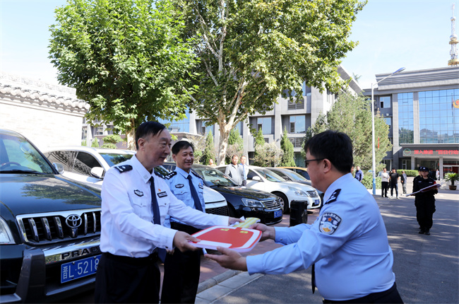 本网讯:(田哲斌)9月23日上午,尧都区公安局举行警用车辆发放仪式,将9辆新购置的警用车辆发放至基层一线实战单位。区公安局党委副书记、政委杨玉波出席活动并为接受警车单位发放了警车钥匙,党委委员、副局长褚韶勇作临战动员讲话,党委委员、指挥中心主任张立功主持仪式。