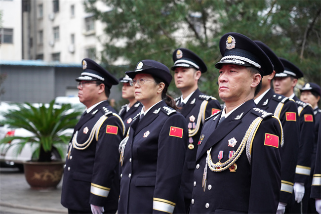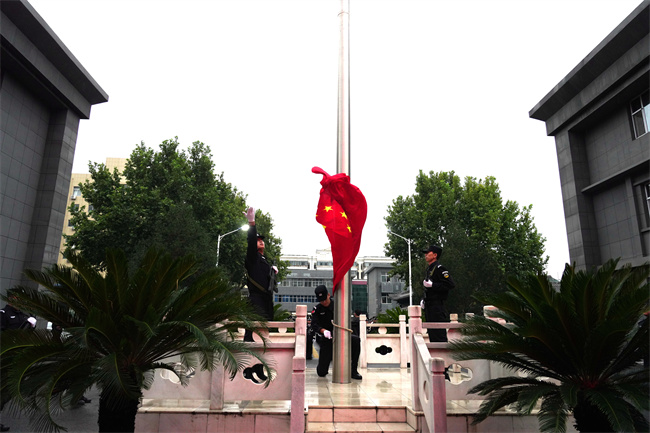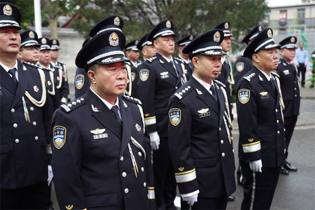 升国旗仪式开始,全体民警、辅警整齐列队,警容严整,由特警队员组成的国旗护旗手迈着铿锵有力的步伐走向升旗台,在雄壮嘹亮的《义勇军进行曲》中,全体民警、辅警面向国旗庄严敬礼,注视着五星红旗冉冉升起,表达对伟大祖国的绝对忠诚和无限热爱。