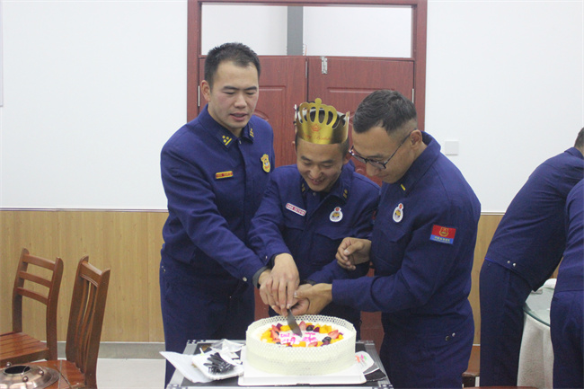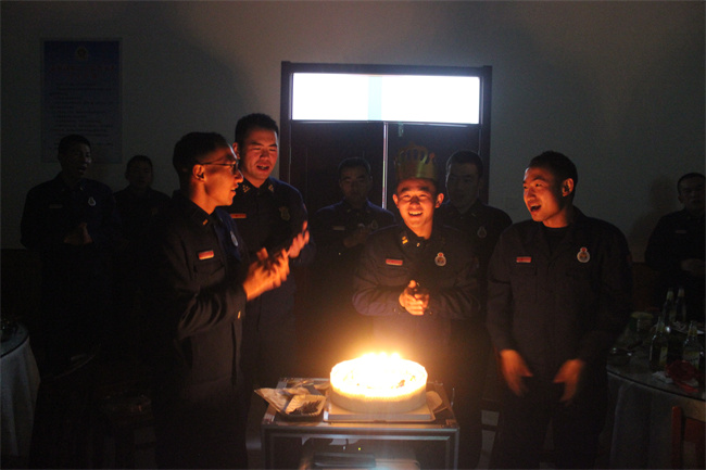 有一群人,每当举国欢庆的时候他们都享受着双倍的快乐,因为他们的生日与祖国母亲是同一天。伴随着欢快的生日歌,生日晚会正式开始,烛光闪闪,笑声阵阵,过生日的寿星戴上生日皇冠,队友的祝福络绎不绝,在这温馨而又幸福的氛围下,分队长李滨说道:“感谢祖国,给予我们无忧无虑的生活,祝我们伟大的祖国繁荣昌盛,祝朋友心想事成,祝父母身体健康,祝所有人幸福平安,也祝自己生日快乐!”