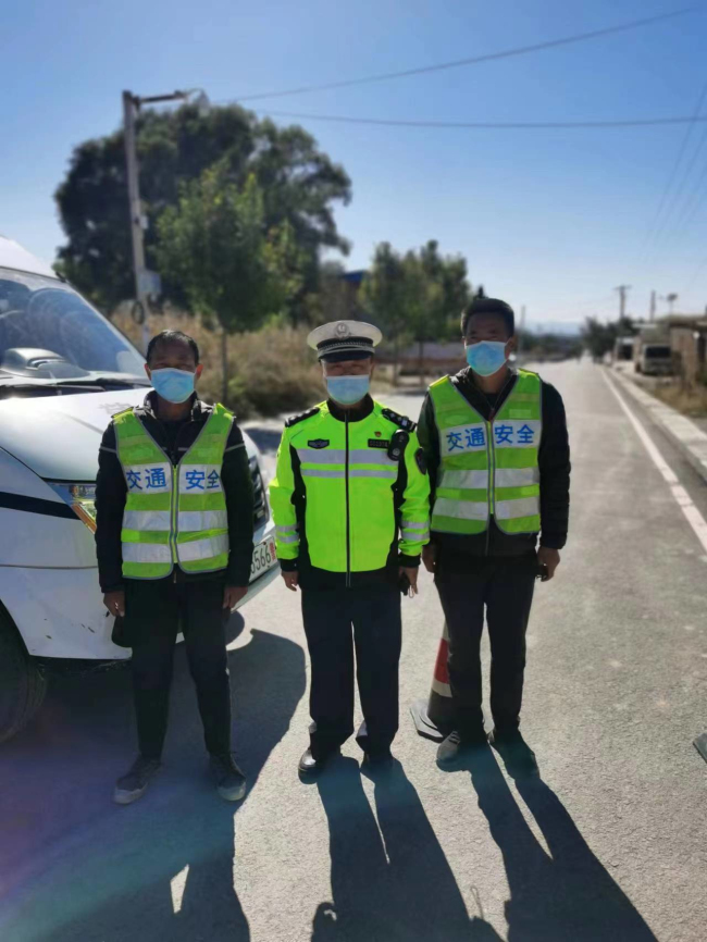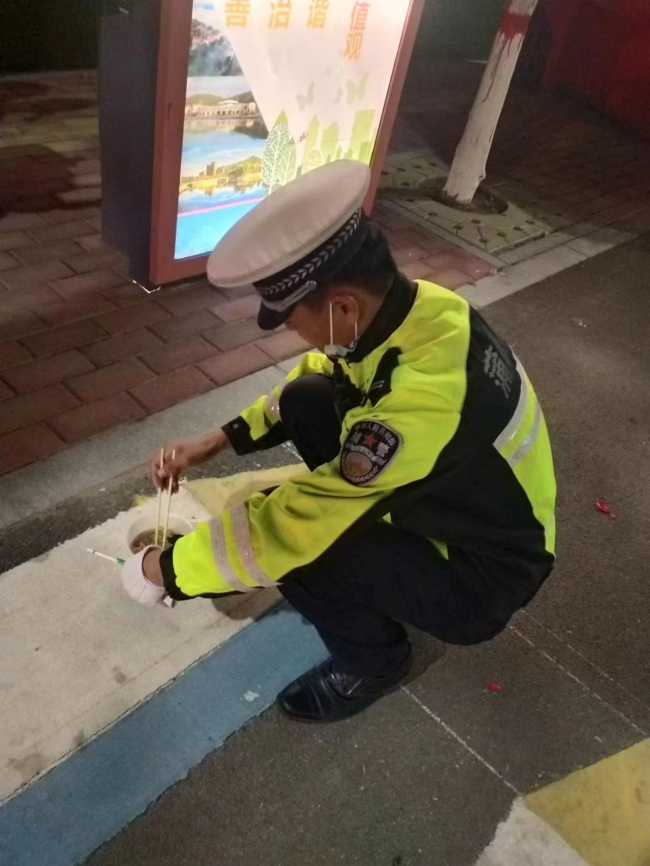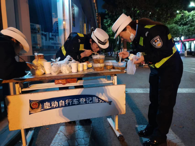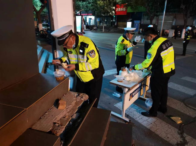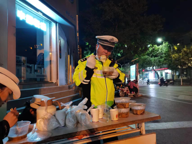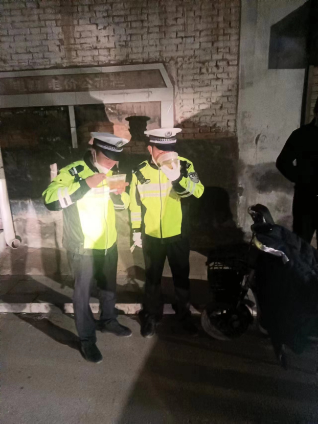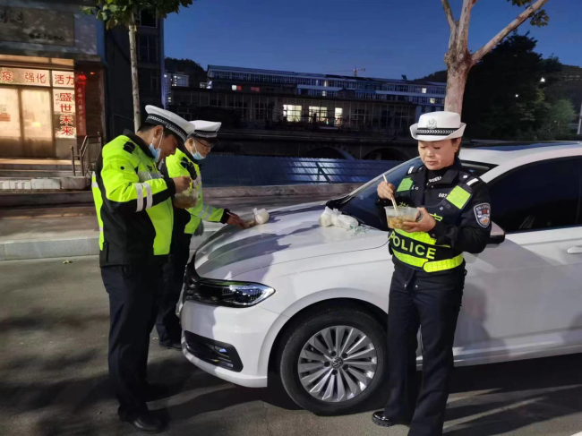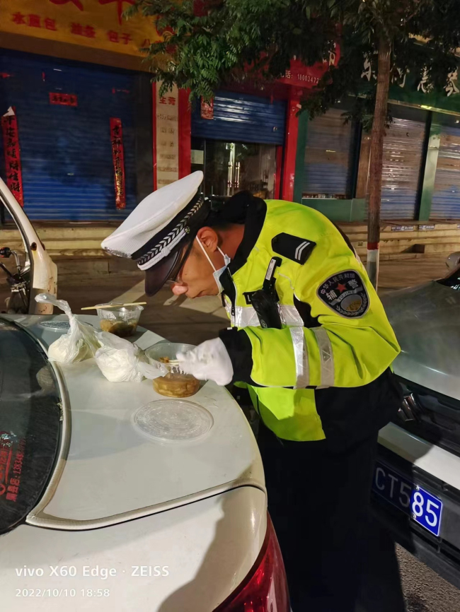 天气寒冷,晚饭时分大队派专人给各个执勤卡口送去了晚饭。