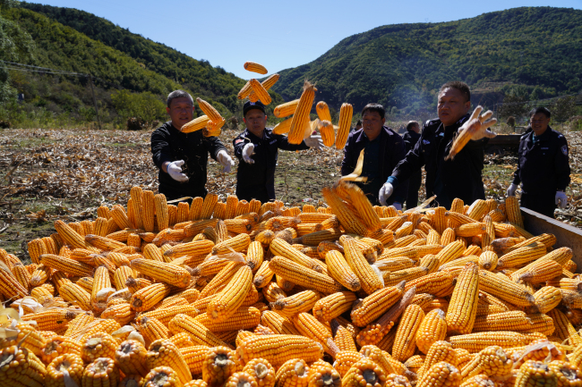 本网讯:(田哲斌)助农秋收,为民解忧。10月10日,尧都区公安局帮扶工作队来到对口帮扶村枕头乡河底村,为脱贫监测户王大娘抢收秋粮。