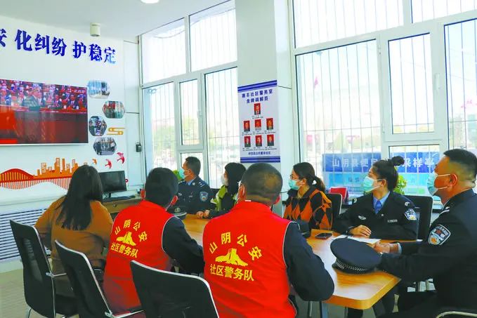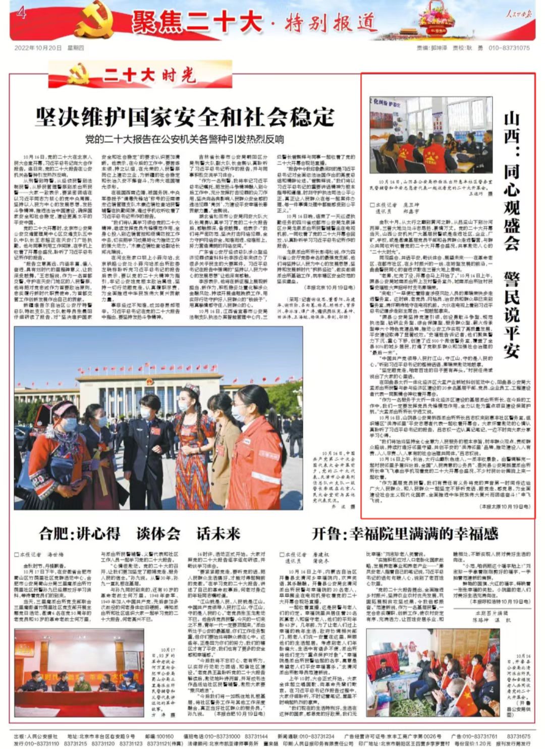 同观盛会、共话平安,畅谈体会、展望未来……在革命老区、在都市社区,在乡村振兴的一线、在转型发展的前沿,一曲曲警民同心的奋进欢歌在三晋大地上奏响。“老秦,忙完了没,开幕会马上开始了。”10月16日上午,隰县公安局城南派出所上友村警务室外,城南派出所驻村民警史福胜大声招呼村支书秦瑞荣。“来啦!”一早便忙着排查涉疫风险人员的秦瑞荣快步走进警务室。这时候,老党员、网格员、治安员和群众早已来到警务室,满怀期待地守在电视机前。大伙在电视上看到习近平总书记健步走到主席台,一起鼓起掌来。“隰县公安局坚持党建引领,创设勇敢斗争型、规范执法型、钻研业务型、综合保障型、服务群众型、薪火传承型等六个特色党建品牌,推动公安工作实现了高质量发展,平安建设取得了显著成效。”史福胜告诉记者,他们聚焦警力下沉、重心下移,创建了近500个微信警务室,覆盖了全县80%的城乡居民,打通了党联系群众和加强社会治理的“最后一米”。“中国共产党领导人民打江山、守江山,守的是人民的心。”听到习近平总书记的铿锵话语,秦瑞荣激动地鼓掌。“坚定跟党走,咱老百姓的日子更有奔头。”村民任伟斌说出了大家的心里话。在阳曲县太忻一体化经济区大盂产业新城科创驱动中心,阳曲县公安局大盂派出所民警与参与经济区建设的20余名基层干部、党员、企业员工、工程建设者代表一同聚精会神收看开幕会。“作为一名服务于太忻一体化经济区建设的基层派出所所长,在今后的工作中,我们一定要发挥党员先锋模范作用,全力以赴为重点项目建设保驾护航。”大盂派出所所长宁进文说。10月16日,山阴县公安局桥西派出所所长吕志权来到惠丰社区警务室,组织辖区“洪涛邻里”平安志愿者代表一起收看开幕会。大家怀着激动的心情认真聆听了习近平总书记的报告。吕志权一边认真记笔记,一边不时向大家分享学习心得。“我们将始终坚持全心全意为人民服务的根本宗旨,树牢群众观点、贯彻群众路线,持续打造好邻里守望、共创平安的‘洪涛邻里’品牌,推动建设人人有责、人人尽责、人人享有的社会治理共同体。”吕志权说。10月16日上午,长治,太行山巅秋色迷人,一派丰收景象。出警调解完一起村民邻里矛盾纠纷后,全国“人民满意的公务员”、壶关县公安局鹅屋派出所所长申飞飞拿出手机观看党的二十大开幕会盛况,不少村民纷纷围拢上来一起收看。“作为基层党员民警,我们有责任有义务将党的声音第一时间传达给广大人民群众,和人民群众一起坚定不移听党话、跟党走、感党恩,为全面建设社会主义现代化国家、全面推进中华民族伟大复兴而团结奋斗!”申飞飞说。