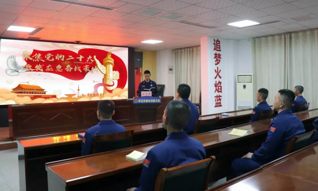 大队一直以来重视发挥指战员自主学习、自主教育的主动性和创造性,不仅把大家当作受教育者,也发动他们成为传播者。积极开设“蓝焰课堂”围绕党的二十大精神,梳理指战员关注的热点问题,广泛收集资料、拓展素材范围,精心备课认真宣讲,把党的二十大精神送到指战员身边。