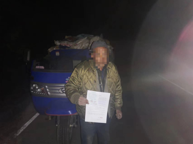 本网讯:(杨婷)2022年11月10日,蒲县公安局交警大队公路巡警中队民警在辖区开展执勤执法工作,15时9分左右,一辆无牌号违法载人三轮车驶入民警的眼帘,民警立即示意该驾驶人停车接受检查。