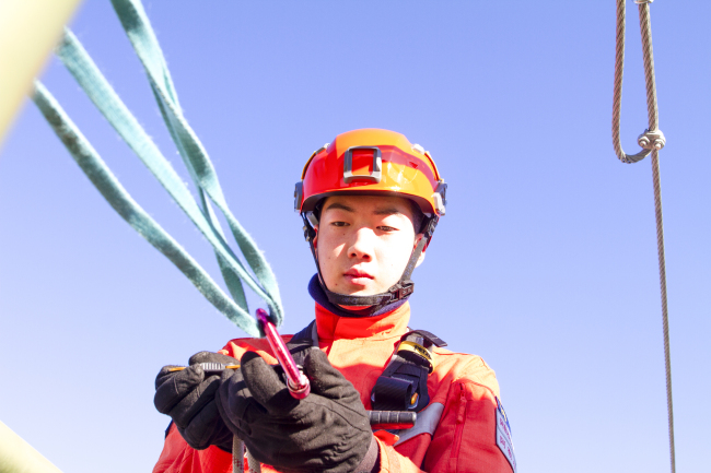 实战是检验战斗力的唯一标准。在训练场上,一中队班长李致强正扶着吊篮式担架在垂直的岩壁上向上缓慢的移动着,随着越往上走,岩壁越来越陡,担架开始重心不稳、出现倾斜现象,李致强感觉上面队友收绳索的节奏也开始乱了,他一边大喊道:“不要慌,慢一点,稳稳向上拉!”一边双手死死的扶住担架不让它偏向一边,担架在他的带动下缓缓向上移动……经过近10分钟的紧张救援,“伤者”终于被成功就上悬崖安全“获救”。