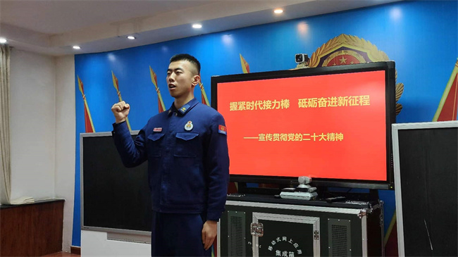 “人人上讲台”活动是大队长期以来用于引导广大指战员总结分享工作经验、相互学习、共同进步的群众性自我教育活动,旨在让每名指战员走上讲台讲述自己好的经验做法,发扬个人优点。在党二十大胜利召开之后,全国上下都在兴起学习之风,大队的四级消防士王家明紧扣“对党绝对忠诚”的思想以“握紧时代接力棒,砥砺奋进新征程”为题,紧紧围绕党的新时代精神为内容,开展了一堂催人奋进的授课。