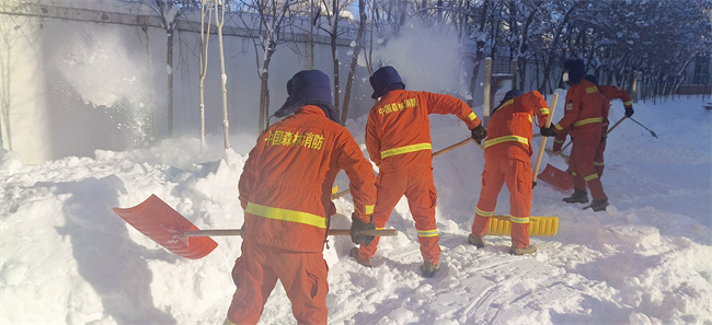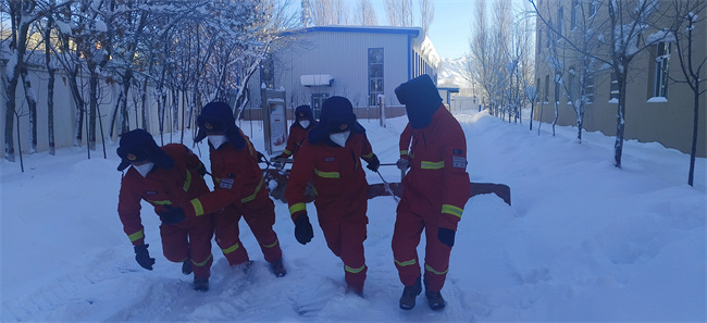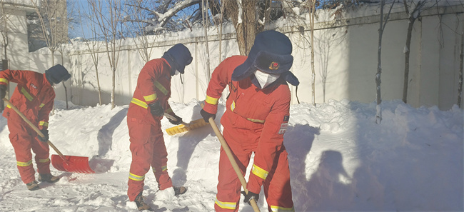 降雪结束后,在干部骨干的带领下,全体队员不畏严寒,积极投身到扫雪队伍中,大家挥舞着扫雪工具对营区内的积雪进行清扫。队员们齐心协力,配合默契,有的铲、有的推、有的扫,干的热火朝天,忙碌的身影在皑皑白雪中构成了一道靓丽的风景线。