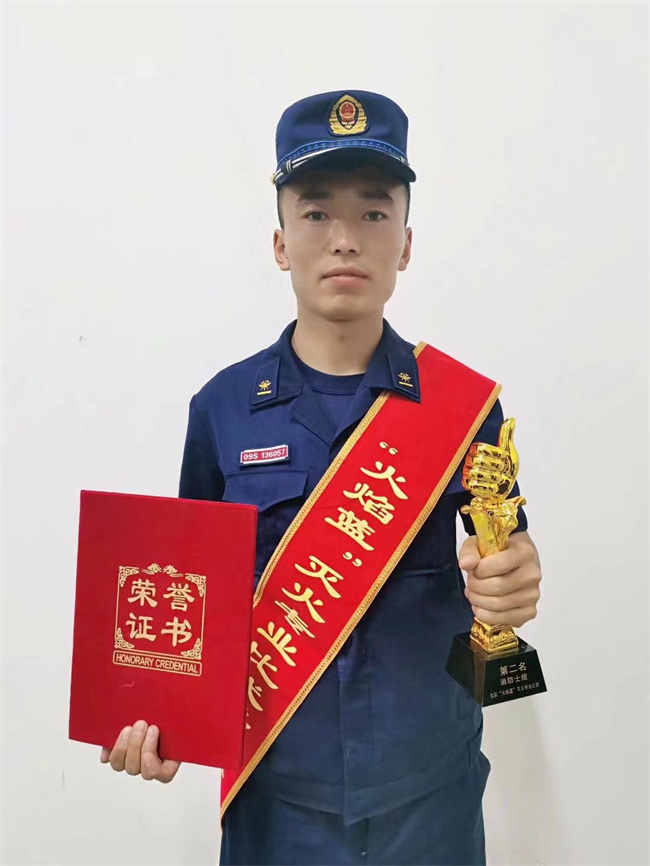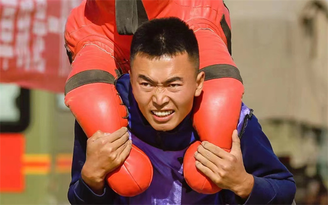 “想要第一,接着练!”包文才是这样说的,他也是这样做的。每天早晨加练、晚上加练,不断逼迫自己挑战极限,脚绑沙袋、身背背囊,一跑就是十几圈。每次训练下来,衣服都是湿透的,走路也打颤,吃饭时筷子都举不起来。就这样突破、突破、再突破,包文才终于成为了中队第一名。2021年,包文才被选拔到总队参加了“火焰蓝”灭火技能尖子比武,在比武中取得优异的成绩,荣获三等功。
