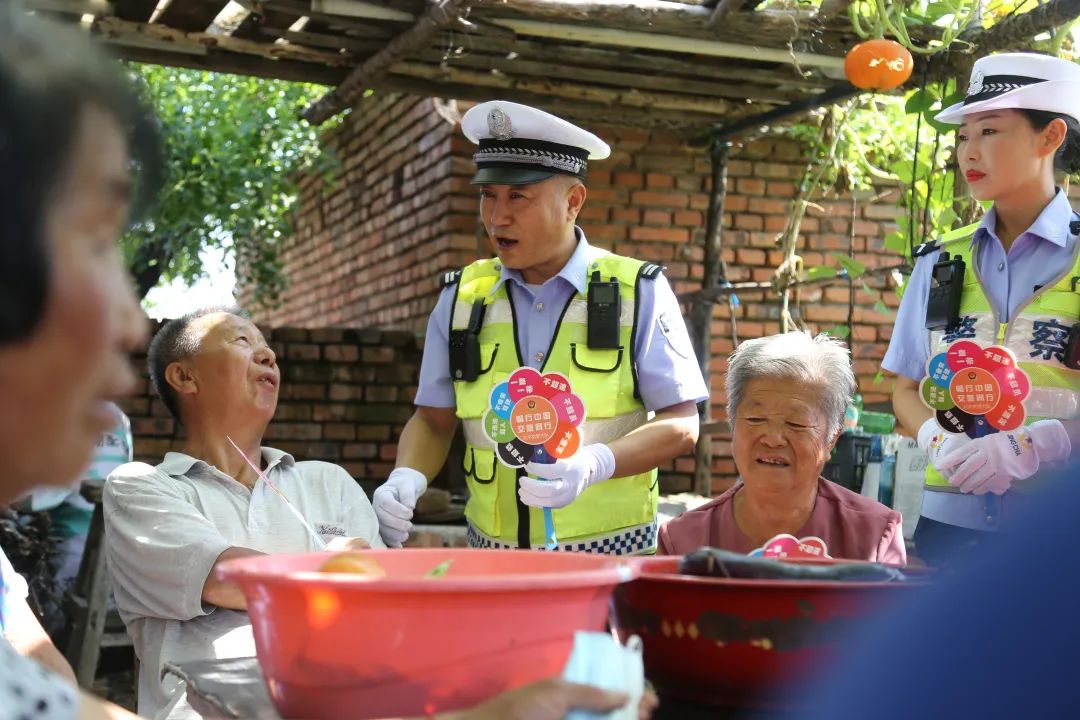 △ 8月2日,辽宁省阜新市公安局交警支队太平大队民警辅警深入太平区水泉镇西山村,为老年人宣讲安全出行知识,并赠送印有交通安全提示内容的扇子。冷吉峰 摄