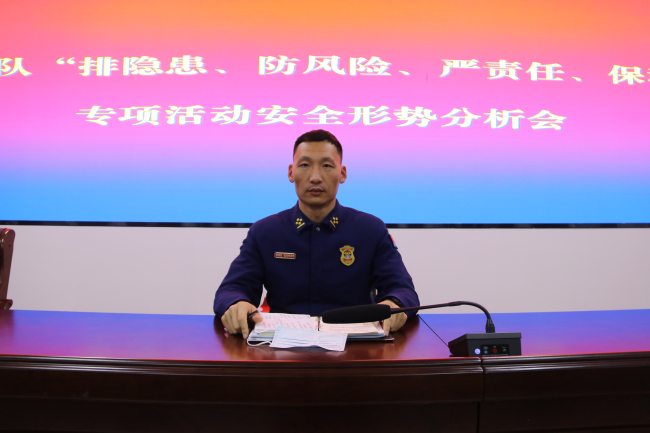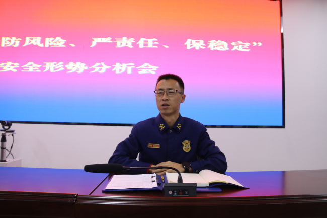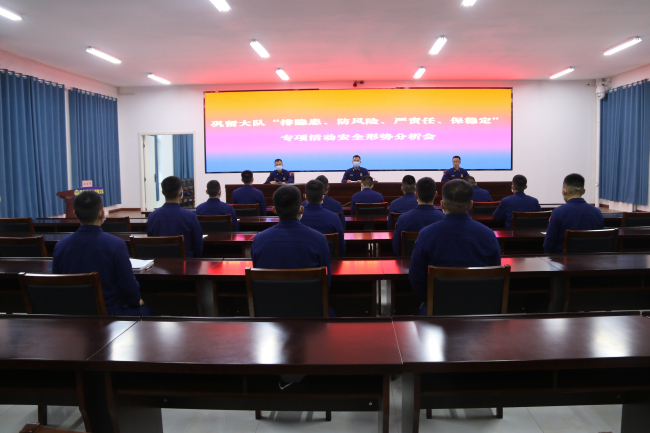本网讯:(魏富满 吴渊)为贯彻落实党的二十大精神,统筹推进疫情防控和年度收尾工作,根据支队统一安排部署和大队“排隐患、防风险、严责任、保稳定”专项活动实施计划,12月7日下午,巩留县森林消防大队及时组织召开安全形势分析会,会议由徐兵山副大队长主持,大队全体班长骨干以上人员参会。