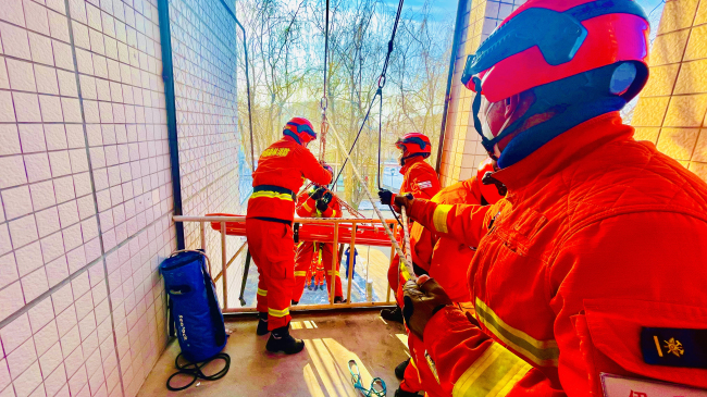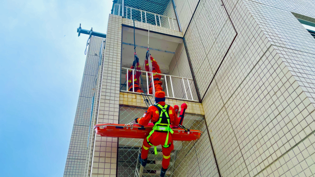 本网讯:(滕格斯) “报告指挥员,悬崖下方发现受困人员,请指示!”“迅速制作绳索救援系统,上方准备下放救援担架,对受伤人员进行营救……”