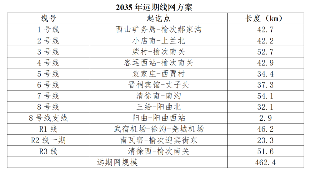 2035年远期线网规划共由11条线组成,线网总规模约373.2km,其中换乘车站36座。线网整体呈棋盘网“十横七纵”形态,契合太原市总体空间布局。分为市区和市域两个功能层次,其中1~6号线为市区线,7、8、R1~R3线为市域线。