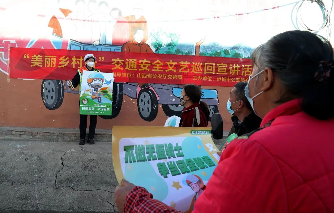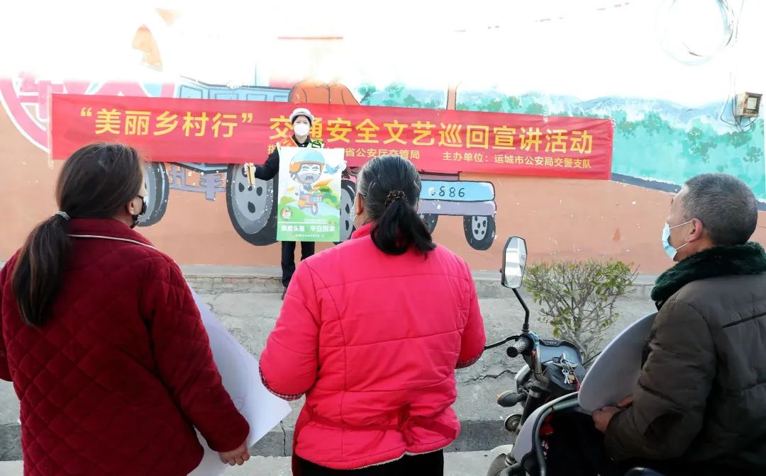近日,由山西省公安厅交管局主办,运城市公安局交警支队承办的“美丽乡村行”交通安全文艺巡回宣传活动,走进盐湖,选取乡村主干道的醒目位置绘制交通安全墙画,建立新的宣传阵地。墙画直观、形象地提示过往驾驶人和村民自觉遵守交通法规,摒弃交通陋习。宣传活动中,民警还利用宣传海报,向村民讲解交通违法行为的危害性,引导广大农村群众养成良好的交通习惯。
