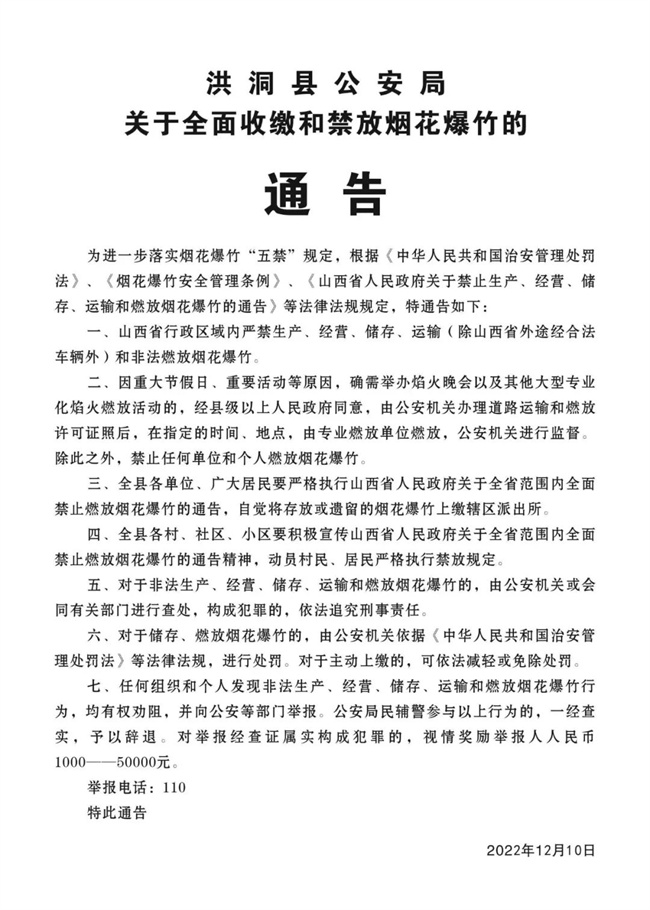 【通告】洪洞县公安局关于全面收缴和禁放烟花爆竹的通告