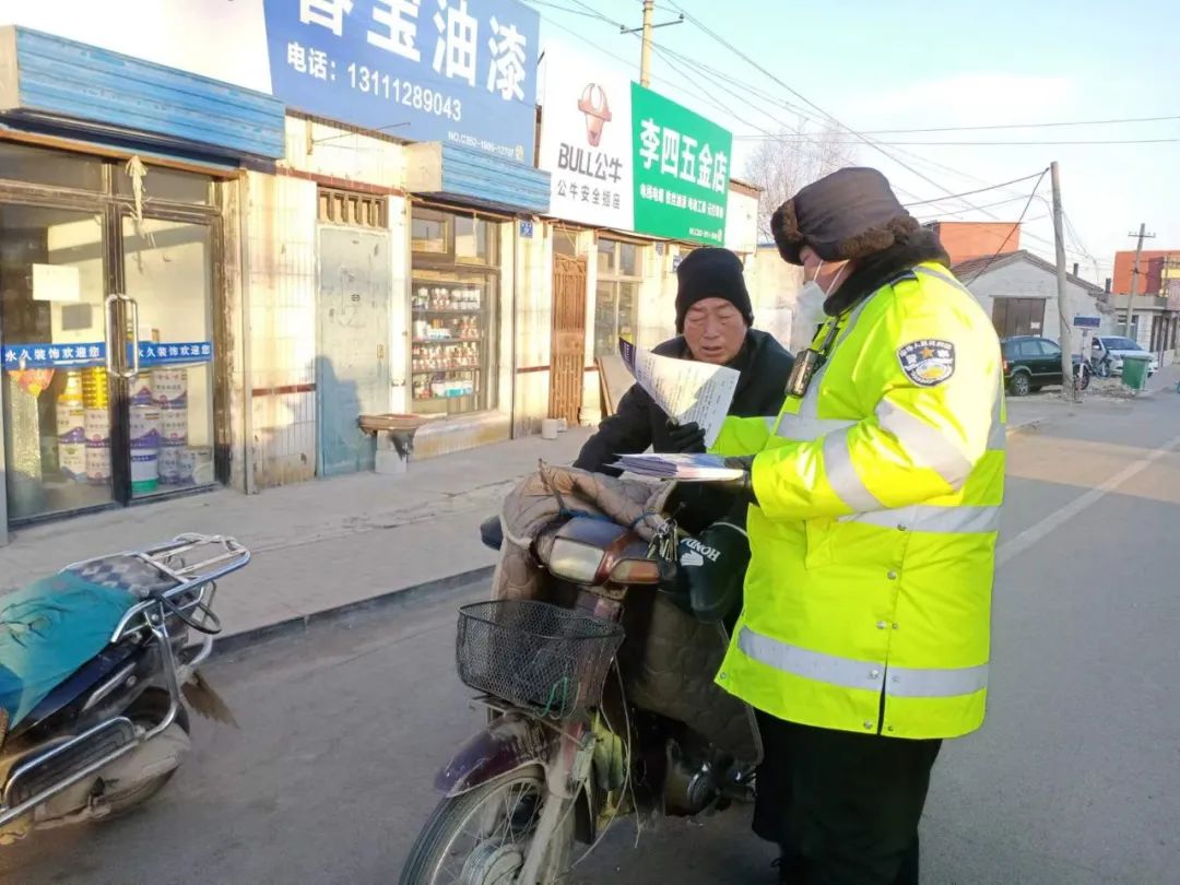 活动中,九大队宣传民警以发宣传单的形式,结合冬季道路交通安全形势和典型交通事故案例视频,用通俗易懂的语言讲解农村道路交通安全常识和出行安全注意事项,告诫群众要牢记“生命至上、安全第一”的理念,时刻保持高度警惕性,自觉摒弃“图方便”“不在乎”“无所谓”“赶时间”等心理,养成遵规守纪出行好习惯,知危险会避险,确保自己和他人的生命安全。
