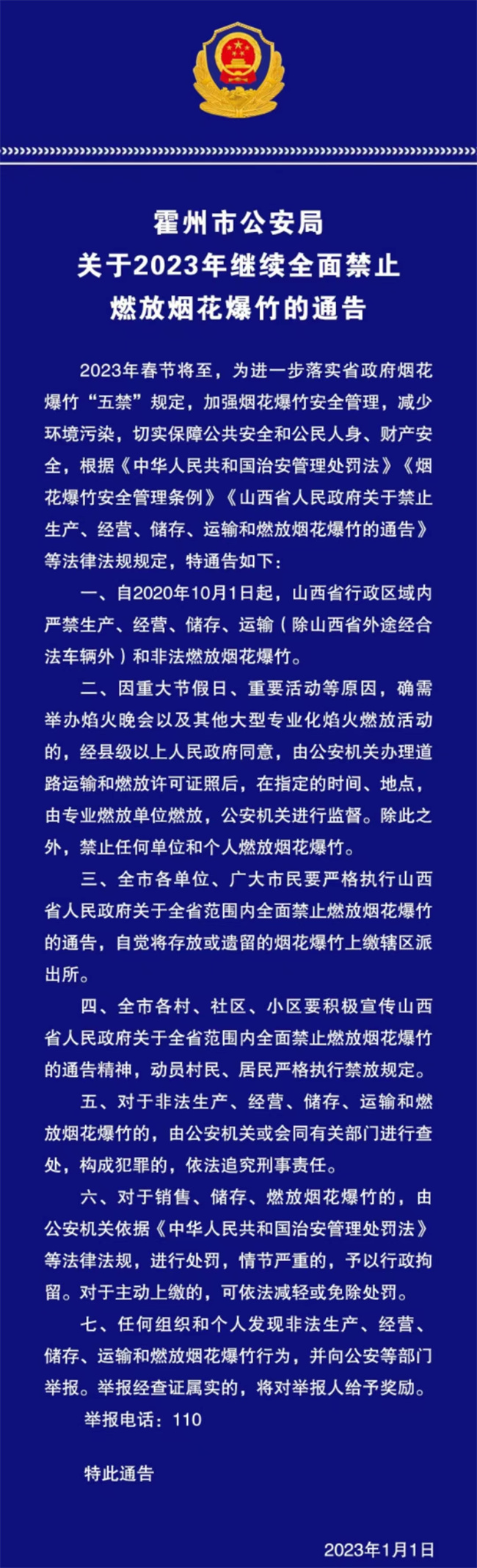 【重要通告】霍州市公安局关于2023年继续全面禁止燃放烟花爆竹的通告