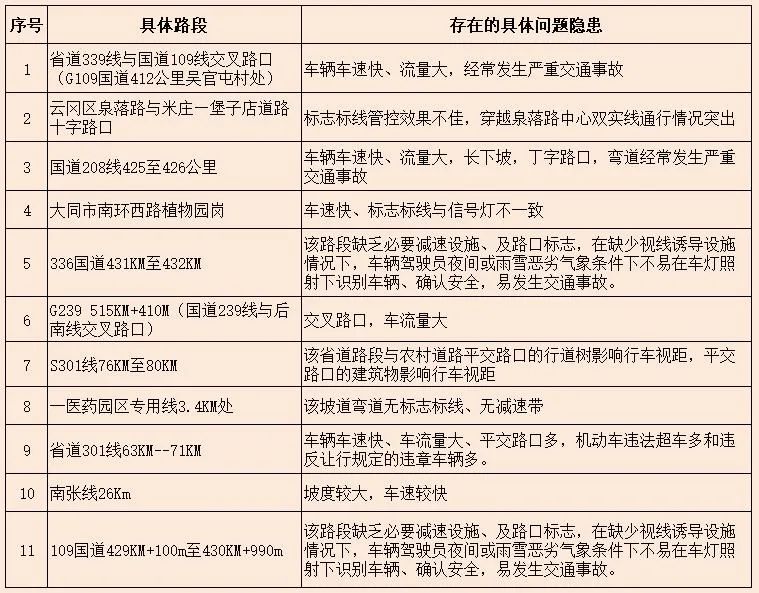 大同交警排查出严重安全隐患和事故多发点段11处,希望驾驶人在途经上述路段时,注意观察,谨慎驾驶,减速慢行。