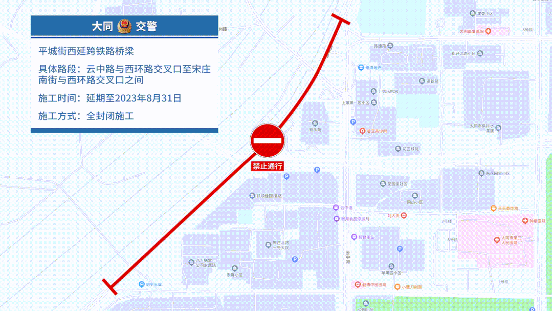 平城街西延跨铁路桥梁(云中路与西环路交叉口至宋庄南街与西环路交叉口之间),全封闭施工延期至2023年8月31日。