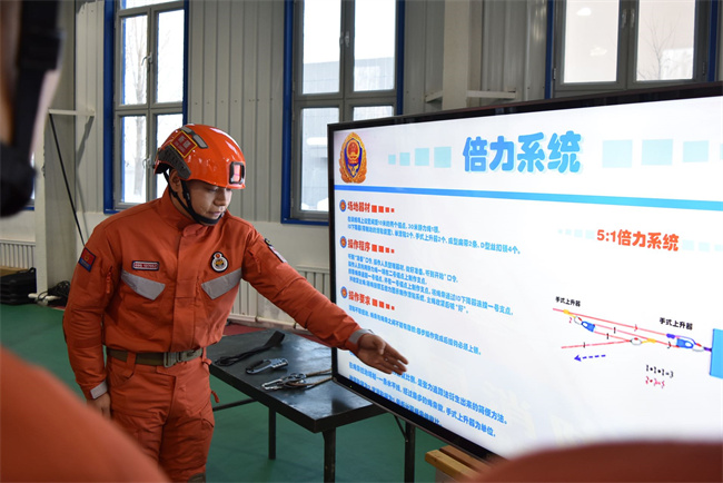 大队坚持“紧贴实战、突出重点、确保安全”原则,把科学施救、安全救援理念贯穿其中,反复练习。由教练员组织全体消防救援人员编成若干个小组,分别对绳索倍力系统、器材顶撑等内容进行训练,并按照操作规程对各类地震救援装备逐个进行体会练习。