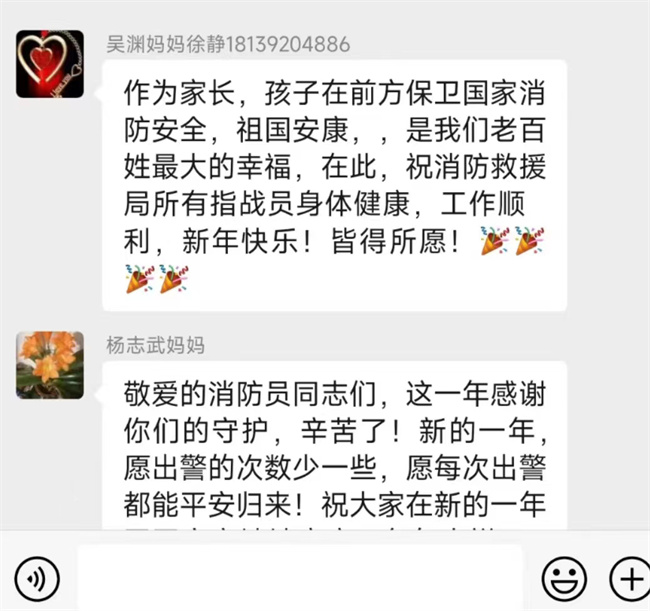 四级消防士吴渊的妈妈徐静收到来信后表示:作为家长,孩子在前方保卫国家消防安全,祖国安康是我们老百姓最大的幸福,在此,祝所有指战员身体健康,工作顺利,新年快乐!皆得所愿!