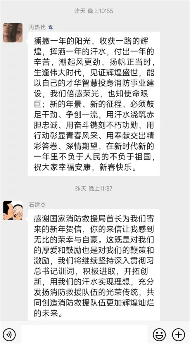 预备消防士再热代感慨的讲到:新的年景、新的征程,我们必须鼓足干劲、争创一流,用汗水浇筑赤胆忠诚、用奋斗镌刻不朽功勋,用行动彰显青春风采、用奉献交出精彩答卷、深情期望,在新时代新的一年里不负于人民的不负于祖国,祝大家幸福安康,新春快乐。