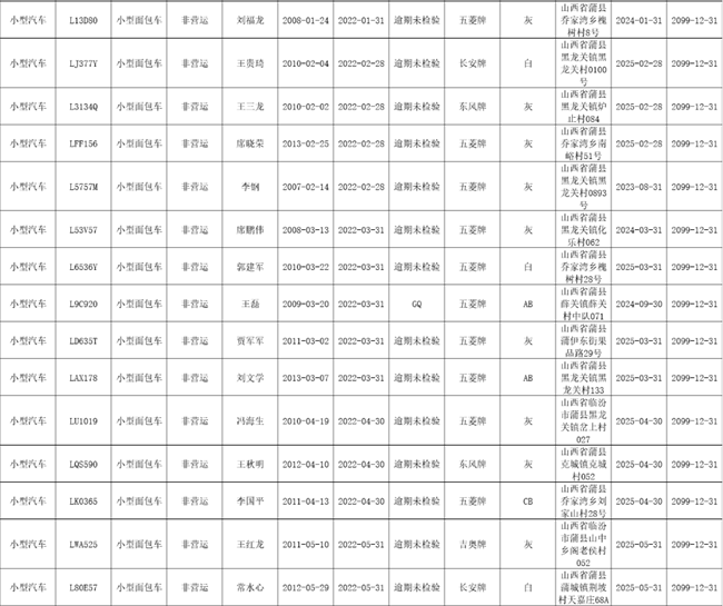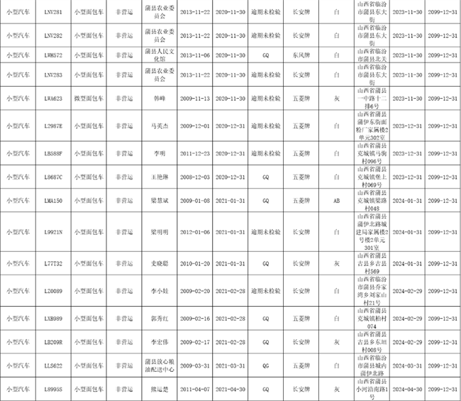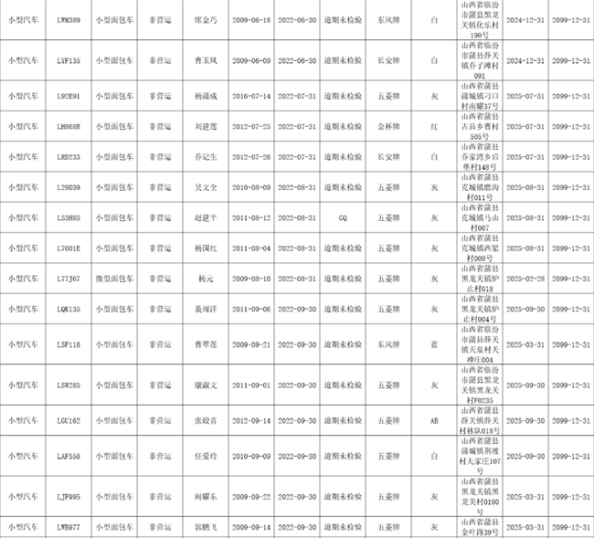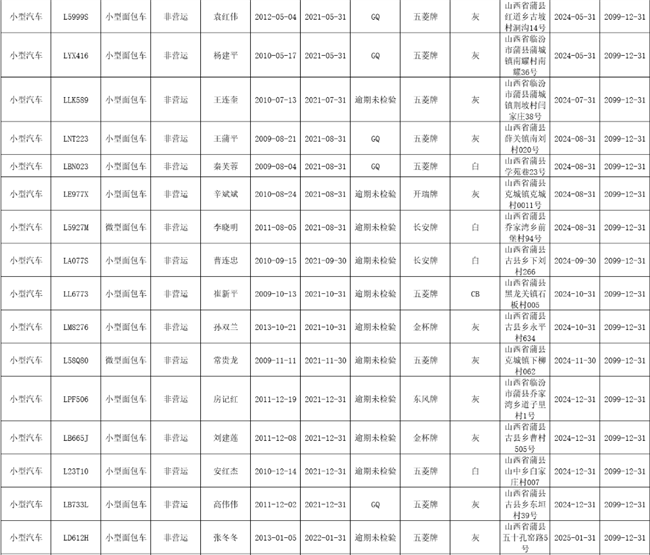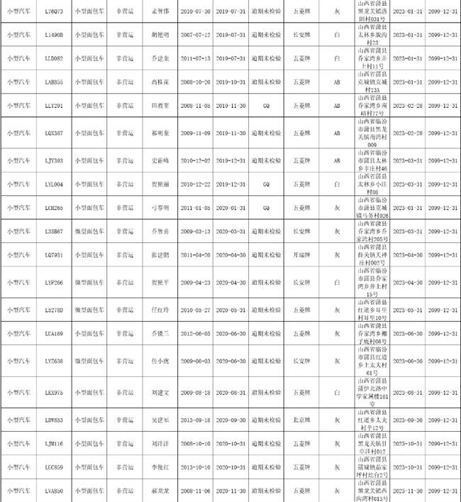 【华北东北冬季整治行动】【五大曝光】蒲县公安局交警大队曝光2023年度1月份面包车应检车辆明细