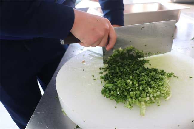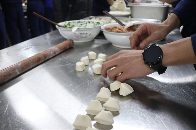 大家围在一起,他们分工明确:有的揉面、有的擀皮儿、有的和馅儿,会包的指战员已经开始脱衣服准备大显身手了,不会包的指战员也不闲着,拿蒸屉、找面粉、揉面团,大家忙的不亦乐乎。整个过程中,指战员们一起动手,互帮互助,无形中让指战员们的友谊得到了升华,不仅增加了指战员们的情感,营造了和谐的气氛,还丰富了指战员们的生活,也让远离家乡的指战员们感受到了家的温暖。和在大家的默契配合下,飞快又熟练地包出一个又一个漂亮的饺子,每一名指战员都参与其中,每一道工序都井井有条,不管饺子包成啥样儿,都遮挡不住指战员们洋溢在脸上的笑容,欢声笑语的现场氛围,散发出浓浓的年味来。
