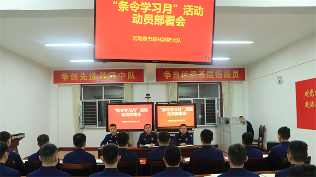 本网讯:(安宝)为进一步提高全体消防救援人员纪律观念,强化自律意识,促使全体消防救援人员增强法治思维,强化条令观念,培育优良作风,不断提升依法从严治队水平,推动队伍正规化建设高质量发展,全力维护队伍安全稳定。2月1日,阿勒泰地区森林消防支队阿勒泰大队召开2023年“条令学习月”活动动员部署会。
