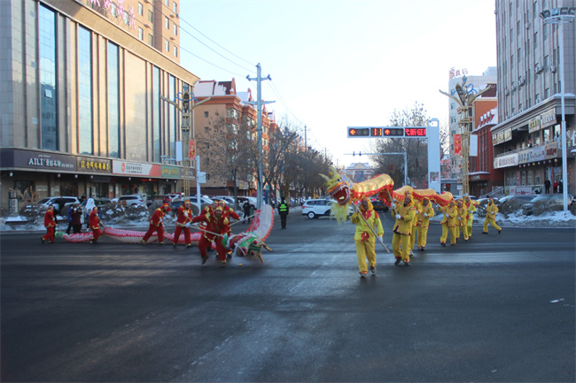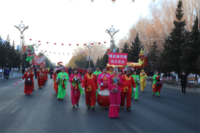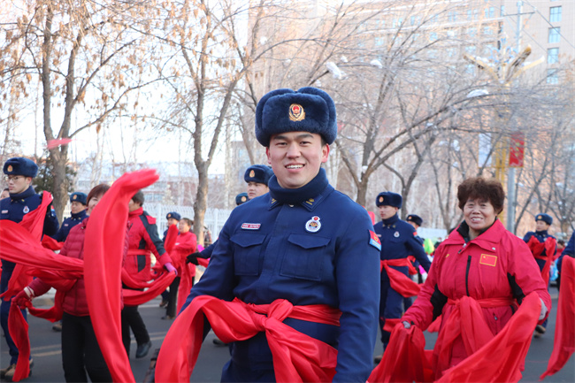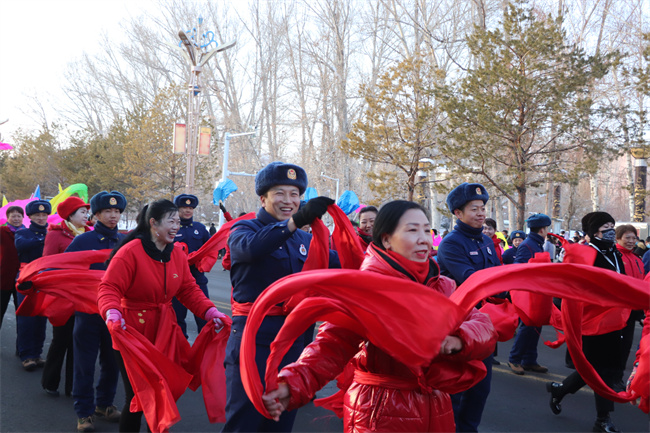 喧天的锣鼓声中,鲜艳的绸子随着欢快的鼓点挥舞起来……由森林消防员和社区工作人员组成的社火队正在红红火火闹元宵。喜庆的锣鼓、动感的节奏,大家身着艳丽的服装,腰系彩带、手舞彩扇踏着欢快的鼓点,尽情地扭着秧歌,展现着他们快乐富足的新生活和积极向上、团结奋进的精神状态。