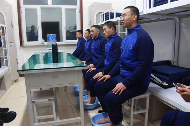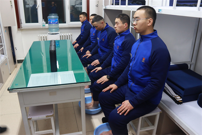 训练结束后,各中队组织全体人员进行拉伸放松,并利用晚上课余时间,用热水泡脚缓解训练后带来的疲劳。