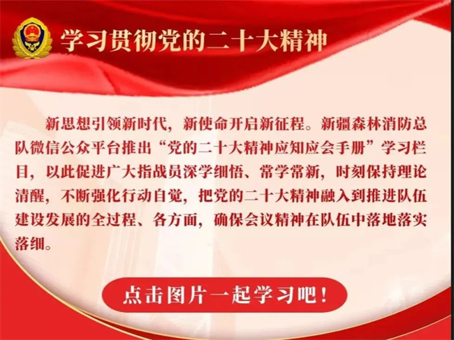 总队专题下发《通知》安排部署,区分3个阶段安排20项规定动作统筹推进,每周三分专题集中组织学习解读,整理下发《党的二十大精神要点手册》,结合疫情实际先后组织15期线上要点问答,确保大会精神入心入脑。