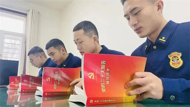 总队把学习贯彻党的二十大精神作为党委会议、中心组学习的“第一议题”,开展学习研讨和体会交流,组织12名支队级领导组织线上交流学习体会;基层指战员采取三两分钟话感悟、三五句话谈体会、三五成群搞交流的方法,深刻领悟大会精神实质。