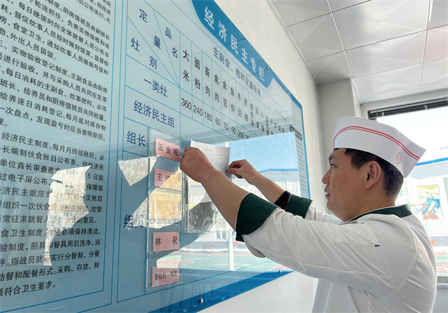 司务长、炊事班长根据伙食标准、大队训练计划、物质条件、季节气候和各中队生活习惯等,每周制订一次食谱,并交经济民主小组研究,单位干部批准;厨房值班员是群众参加管理伙食的代表,除了负责验收购买食物并在单据上签名外,还要掌握就餐人员数量及实物定量,对填写《给养逐日消耗凭证》的情况进行监督并签名,检查饭菜准备情况,监督食堂卫生,帮助炊事班工作;大队利用每日晚饭时间对当日伙食账目进行公布,炊事班长和厨房值班员负责对当天消耗的主食、副食、调味品过秤,并填入《伙食管理登记本》用以反映基层单位伙食管理情况并作为月终盘点、结算账目的依据。在刚性落实“1126、6211”基础上,充分发挥经济民主,广泛收集队员伙食意见,科学合理制做菜品,坚持将伙食保障工作“做实、做精、做好”。