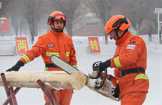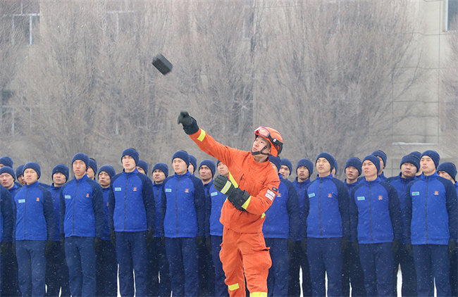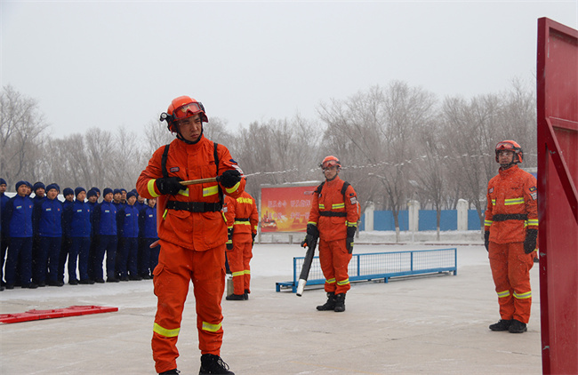 “在扑救森林火灾中,风力灭火机基本使用技术大致分为:‘割’、‘压’、‘顶’‘挑’‘扫’、‘散’,6个字……”在实践操作中练员采取理论讲解、示范教学的方式对风力灭火机操作使用、水枪操作使用、油锯操作使用、点火器操作使用、灭火弹投掷等课目进行了全面的演示。而后组织新消防进行实践操作训练,期间全体新消防员、热情高涨、积极参训,作风严谨、仔细揣摩动作要领,克服了严寒天气带来的不利影响,班长率先垂范认真讲解,规范程序,逐人、逐项、逐个内容的组织训练,严扣细训、提高标准,并指出存在问题,及时整改纠正。达到了预期训练效果。